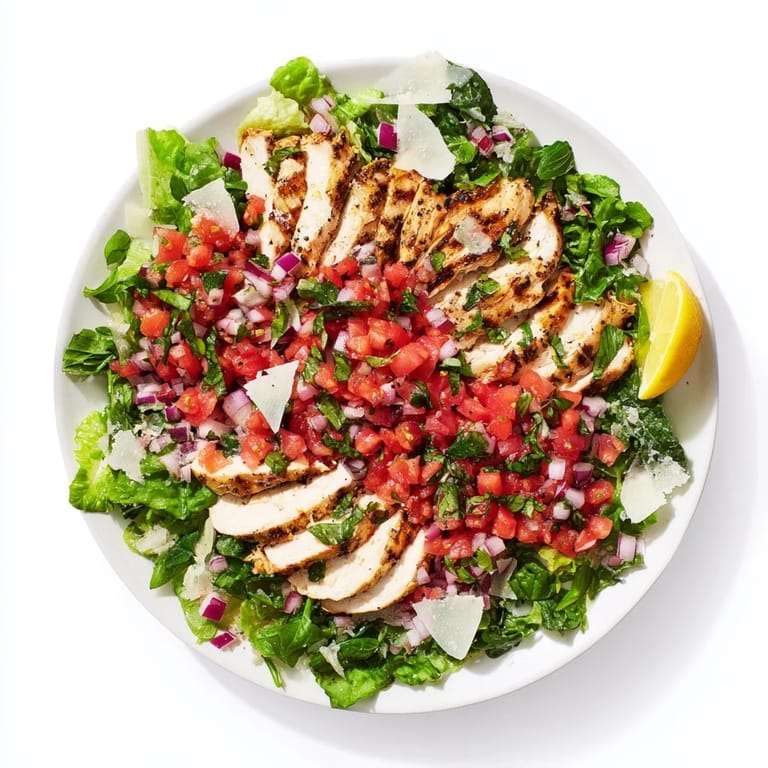 - Spread those mixed greens across a big platter, arrange sliced chicken on top, and spoon the bruschetta mixture generously over everything